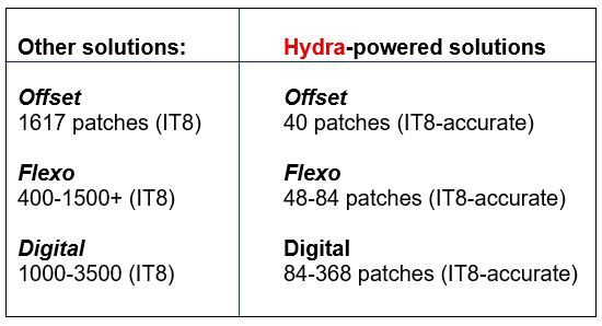 The Hydra spectral prediction engine uses physics to model ink, light, and substrate interaction; and, as a result, is able to calculate profile tables of IT8-level accuracy in just a few minutes, and using a much smaller number of patches.