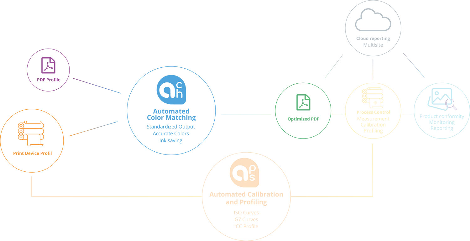 In this globalized workflow scenario, Color Management based on International Standards allows consistent colors throughout the production workflow, from design to PDF to proof to print.